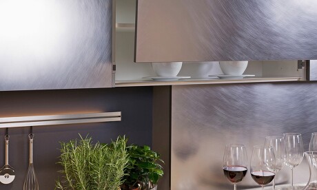 Das ist zum Beispiel unserer Küchenlinie Albarino gelungen. Ihre Fronten in Metall-Optik setzen nun wirklich ausgefallene Akzente. Albarino bietet noch zahlreiche andere raffinierte Oberflächen – von den klassischen Fronten über Schiefer- und Betonoptik bis hin zu edlem Mattschwarz.