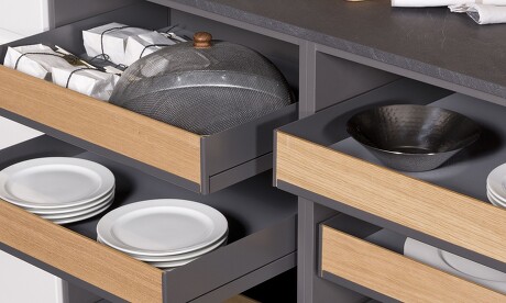 Eine besondere Lösung zeigt das Bild: eine Art Kreuzung aus Schubladenunterschrank und Regal. Auf den Auszügen lässt sich einiges stapeln. Dabei sind Front, Seitenteile und Rückwand der Auszüge aber nur halb so hoch wie die verfügbare Höhe. So haben Sie wunderbar Einblick und im Nu Zugriff auf alles, was Sie hier verstauen.