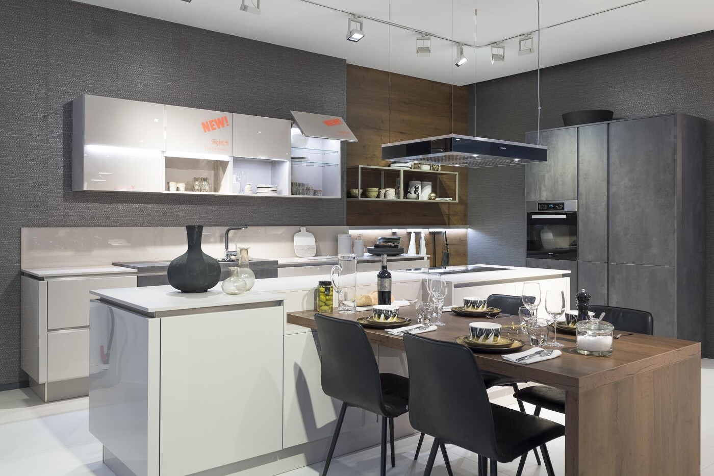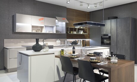 Sie wünschen sich eine Kochinsel mit extra Esstisch? Stellen Sie ihn doch einfach quer zur Theke oder sogar verbunden in T-Form mit extra Vertiefung! Dadurch rücken Kochen und Genuss noch näher zusammen. Gleichzeitig entsteht dadurch noch extra Stellfläche bei Tisch – für Soßen, Brot, Salatschüssel oder den Nachtisch :-) Auch das Abräumen von Tellern und Tassen geht nach dem Essen viel schneller.