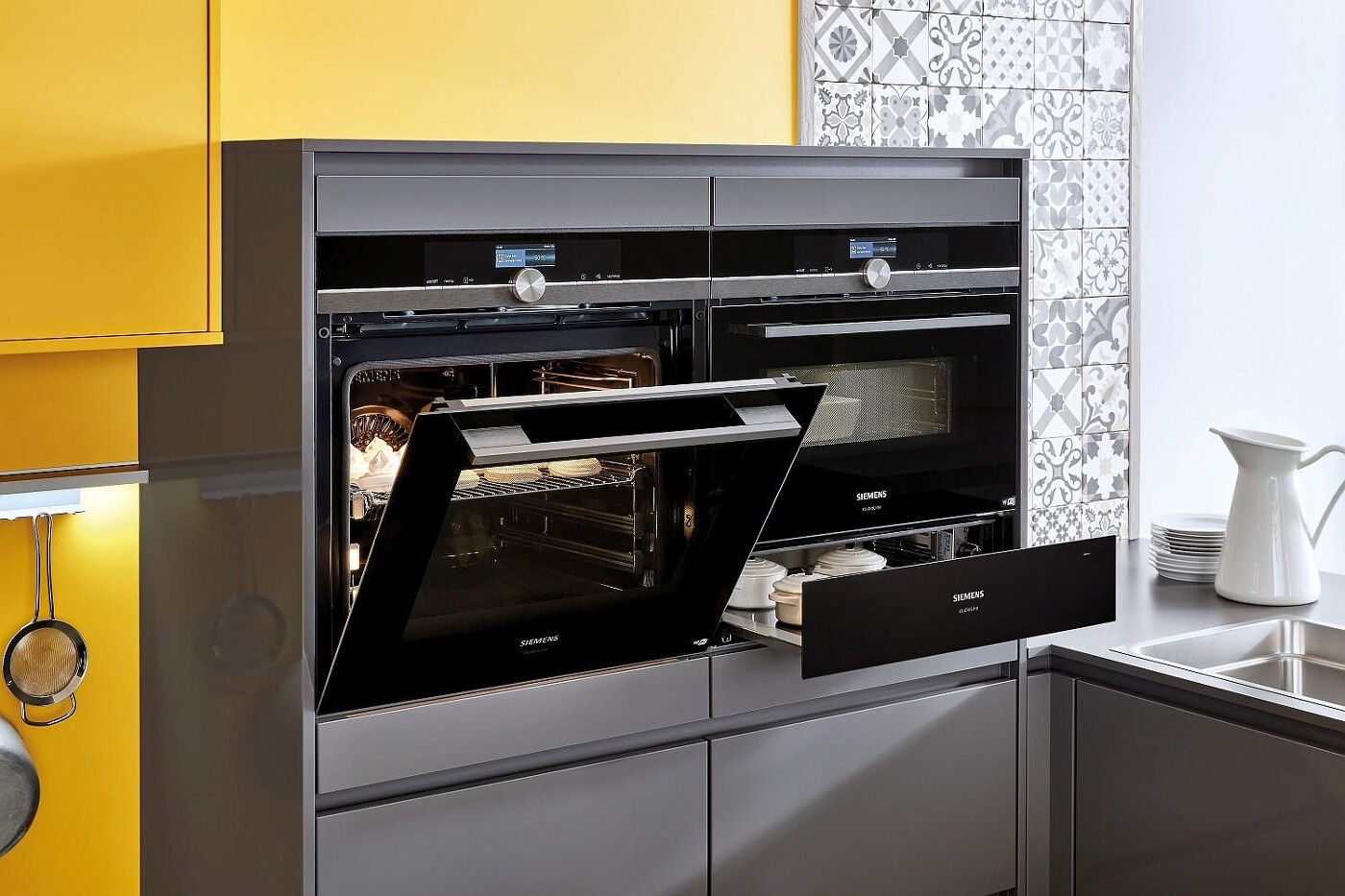 Machen Sie Ihre Schön-Wetter-Küche einfach zum Dauerbrenner, indem Sie sich trauen, ein paar der Küchenschränke mit sonnengelben Fronten zu gestalten. Das Beispiel zeigt, wie toll das aussieht – gerade in Kombination mit Grau oder/und schwarz.