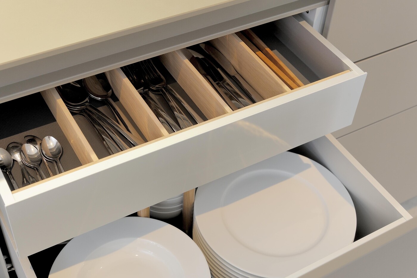 Quer- und Längstrenner sind optimal, um zu verhindern, dass Kochwerkzeug nicht wild durcheinander fliegt. Massivholzstäbe schützen das schöne Geschirr und lassen Töpfen nicht gegeneinander stoßen. Flexible Fächer können beliebig angeordnet werden, um das gesamte Küchenzubehör individuell zu sortieren.