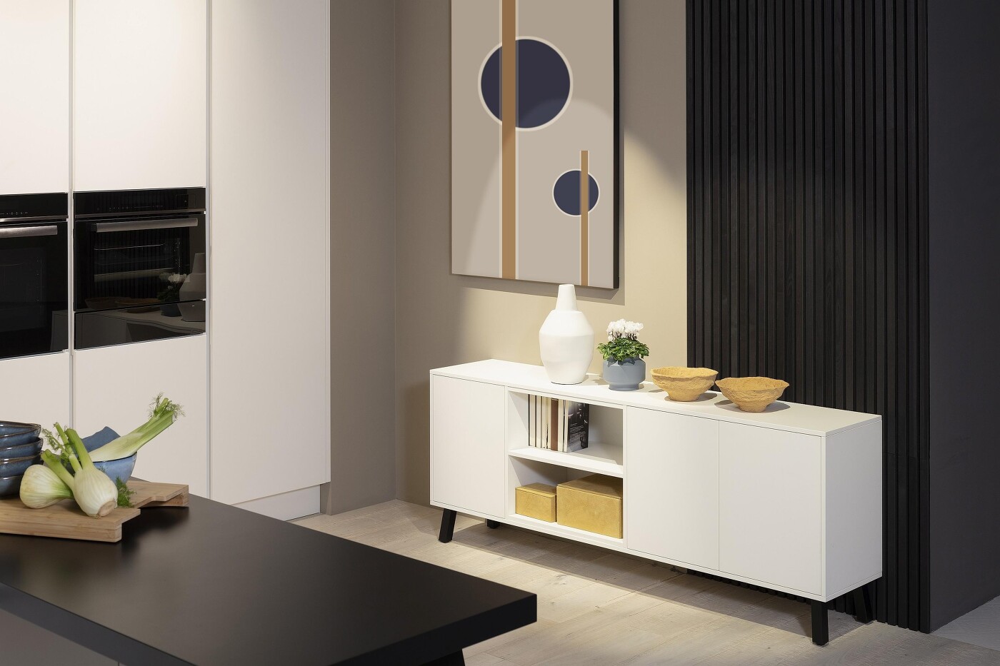 Im Durchgang vom Wohn- zum Küchenraum bietet diese auf wenige Millimeter Abstände perfekt zugeschnittene Front viele Möglichkeiten, um damit Wände zu gestalten oder Schränke stilvoll zu verbergen. Das Foto zeigt, wie sich damit gerade auch in Schwarz ein eleganter Raumteiler schaffen lässt, der zur anderen Seite hin Stauraum als offenes Regal bietet.