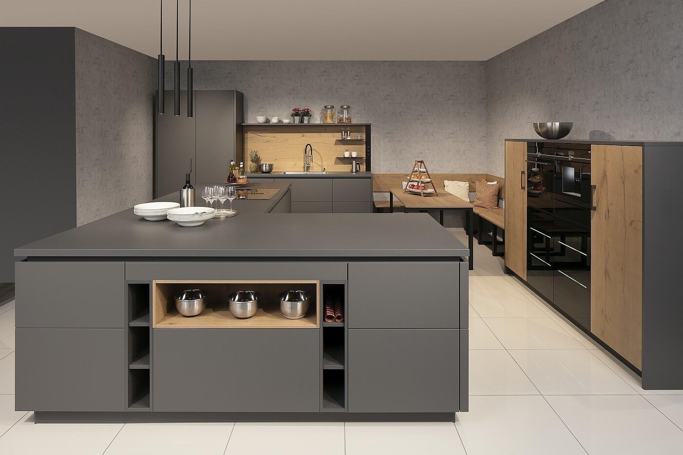 Das gezeigte Beispiel der mattgrauen L-Kücheninsel zeigt, dass diese sich auch sehr gut für offene Küchen eignet: Die zum Wohnraum hin zeigende L-Seite wird mit offenen Regalfächern versehen, in die man dekoratives Geschirr stellen kann, was gleich eine wohnliche Atmosphäre verbreitet.