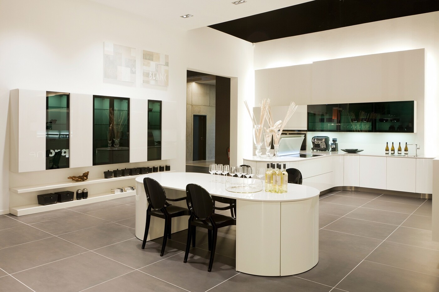 Schwarz hinterlackierte Scheiben setzen die Vitrinen- und Hängeschränke in eindrucksvollen Kontrast zum glänzenden Weiß. Ausgefallene Gläser und Sammlerstücke können dahinter reizvoll inszeniert werden. Die schwarzen Lackstühle und Accessoires sind passend ausgesuchte Konterfeis für dieses stilvolle Küchen-Ambiente.