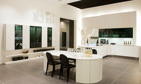 Was verbirgt sich hier nicht alles hinter formschönen Küchenfronten: Auszüge und Schubkästen, hochwertige Elektrogeräte wie Pyrolyse-Backofen und Dampfgarer im Seitenschrank. Der Esstisch nimmt seitlich elegant das Tischgeschirr auf. Versenkbare DownDraft-Tischhaube aus weißem, gebogenem Glas und ein autarkes Induktionskochfeld komplettieren das Premiumsegment.