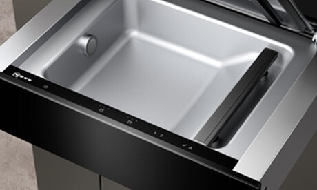 Vakuumiergeräte kennt jeder, aber was soll das als Schublade, und wo ist der Vorteil? Zum einen werden die Schubladen eingebaut, man muss also nicht noch ein weiteres Elektrogerät irgendwo verstauen. Zum anderen entsteht das Vakuum in der gesamten Schublade und das bedeutet, dass man auch Suppen, Soßen oder etwa Mariniertes vakuumieren kann.