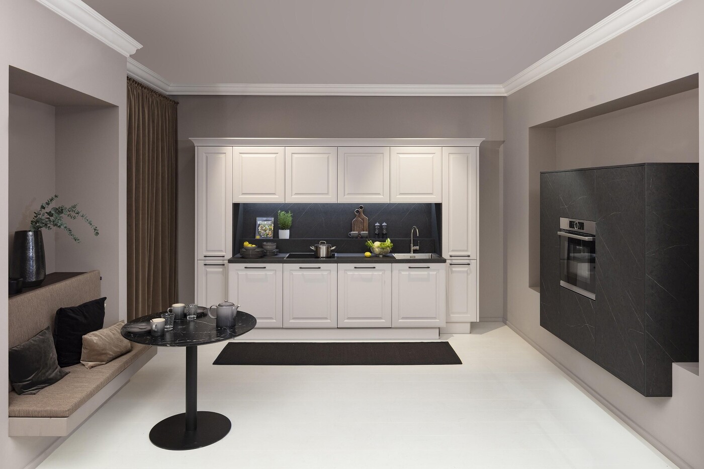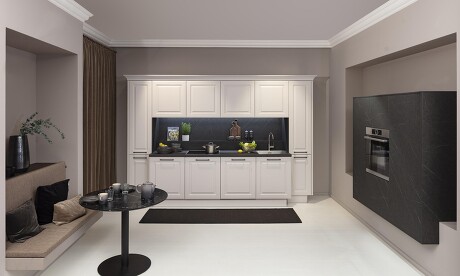 Ist das noch Küche?! – Ja, das ist es! Aber so ungewöhnlich verpackt, wie man es noch nie gesehen hat: Herd und Spüle sind in einer Küchenzeile untergebracht, die wie ein geschlossenes Möbel konzipiert ist und oben – im klassischen Landhausstil – von einem schlichten Kranzgesims abgeschlossen wird. Bewusst grifflos bilden die Rahmenfronten der Oberschränke zusammen mit den seitlichen Hochschränken den für englische Landhausküchen typischen Herdumbau, nur dass hier Spüle und Arbeitsbereich mit umfasst sind. Der starke Kontrast zwischen hellem Toskana Satin Mattlack und dunklem Marmordekor in der Nische wirkt sehr modern.