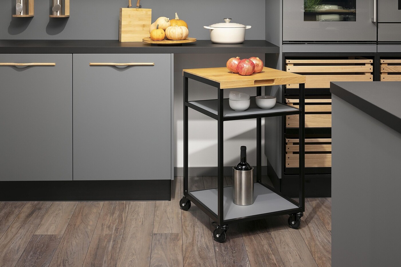 Schon gemerkt? – Die einstigen Teewagen sind längst wieder zurück, und das in den unterschiedlichsten Ausführungen: ganz offen oder auch mit Schubladen oder Schranktüren. Ideal ist es, wenn so ein Wägelchen sein eigenes „Carport“ unter der Arbeitsplatte bekommt, denn dann ist es schnell hervorgeholt und genauso schnell wieder aus dem Weg gerollt.