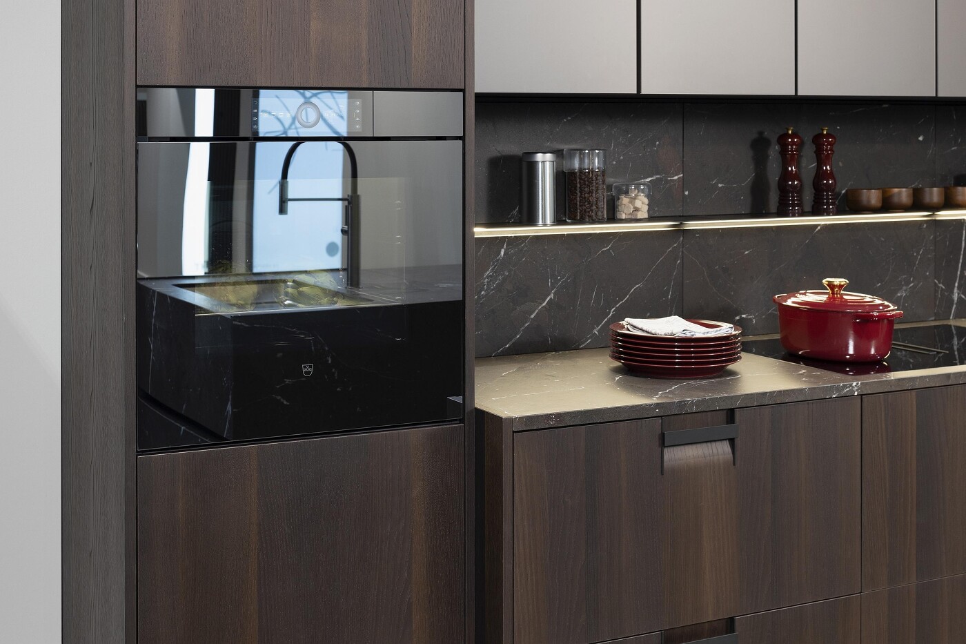 Die Bedienelemente des Ofens sind in das Glas eingraviert. Sie erwachen bei Berührung zum Leben und unterstützen den Garvorgang mit künstlicher Intelligenz. Auch bei diesem Einbaugerät lassen sich über das Display Rezepte abrufen, die der Backofen automatisch auf die gewünschten Garphasen anwendet.