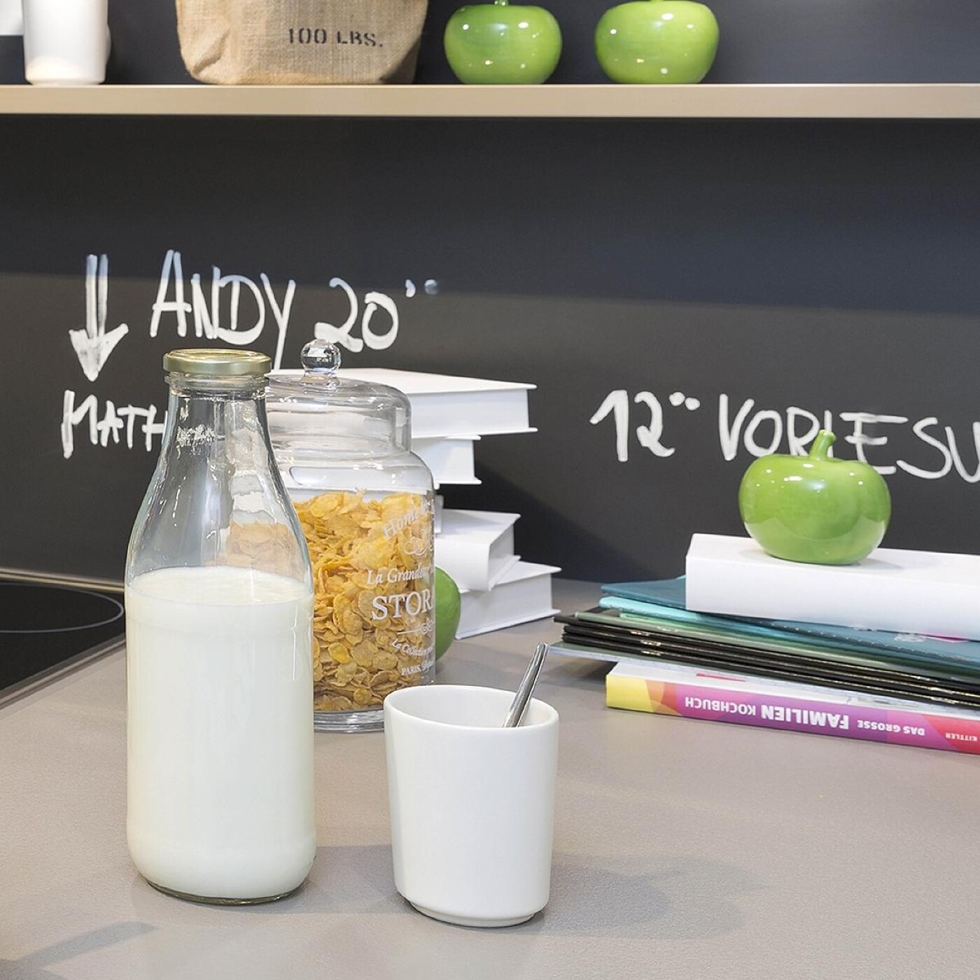 Die Küche ist meist das Kommunikationszentrum in der Wohnung, und es gibt ein einfaches, dekoratives, kommunikatives Mittel, das zu verstärken: Tafelfarbe! Damit können Sie jede ebene Fläche – ob Wand oder Tür oder Nischenrückwand – in ein wahrhaft „Schwarzes Brett“ verwandeln. Für Einkaufszettel, Rezeptideen, kreative Ausbrüche, Notizen an die Familie, Gestaltungsraum für die Kleinen. So einfach. So gut.