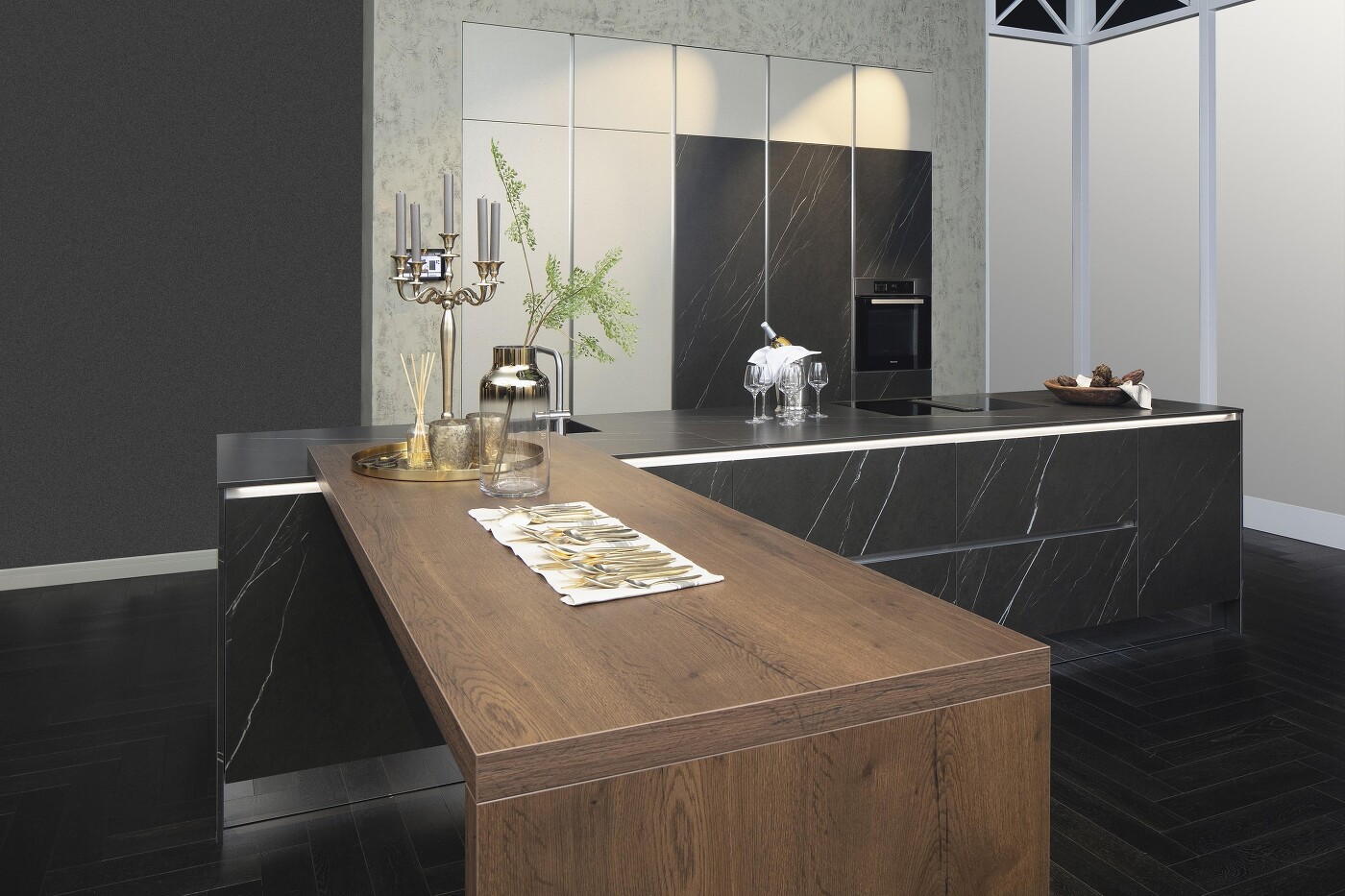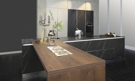 Setzen Sie Lichtleisten doch zwischen Arbeitsplatte und Unterschränken ein! Welch tolle Wirkung man damit in der grifflosen Küche erzielt, gerade dann wenn Fronten und Arbeitsplatte aus demselben Dekor sind, zeigt eindrucksvoll das nebenstehende Küchenfoto. Was aussieht wie feinster Marmor, ist in Wirklichkeit umso härtere Keramik. Aus der kann man inzwischen so viel machen – Sie werden aus dem Staunen nicht mehr herauskommen. Gerne präsentieren wir Ihnen die vielen unterschiedlichen Keramikoberflächen, die es in den passenden Stärken und Größen für Arbeitsplatten, Fronten, aber auch Nischenrückwände gibt!